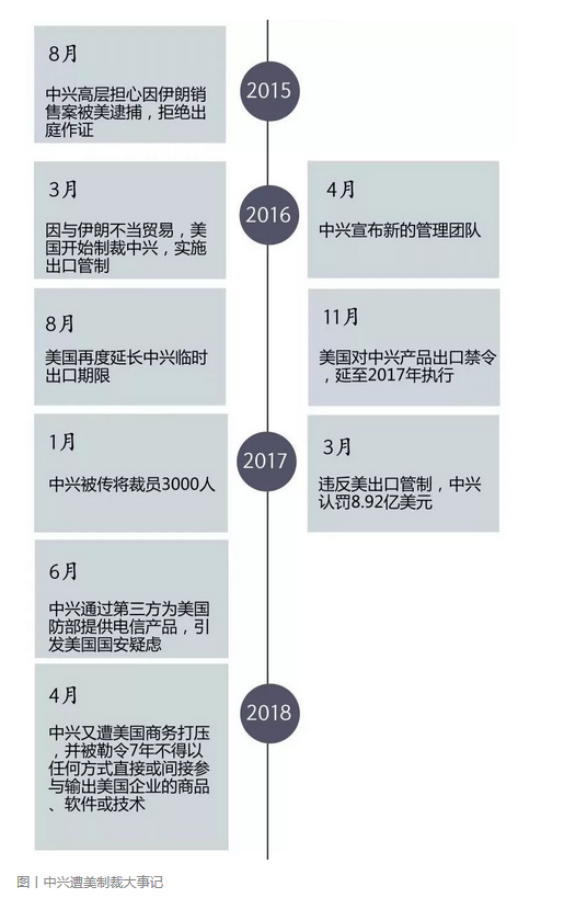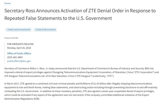美国商务部在美东时间 4 月 16 日宣布,将禁止美国公司向中兴通讯销售零部件、商品、软件和技术 7 年,直到 2025年3月13日。理由是中兴违反了美国限制向伊朗出售美国技术的制裁条款。由于美国公司在这 7 年内都不得卖东西给中兴,对中兴而言,未来不论是产品开发、规划、制造、销售等环节都会造成极大的影响,无疑将重挫中兴的发展。