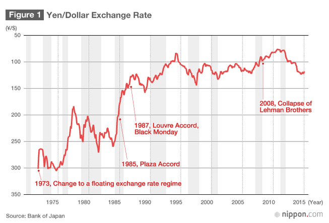 虽然广场协议涉及到多个工业强国,但影响最大的就是日本。广场协议宣布前,美元兑日元大致在1比250的水平,三个月不到,美元兑日元就急剧下滑到1比200,贬值了20%。一年之后,美元兑日元已经下滑到1比150的水平。由于美元贬值速度过猛,1987年上述五国与加拿大又签署了《卢浮宫协议》,意在结束广场协议,阻止美元的持续贬值。但日元的升值势头却无法遏制,1988年美元兑日元达到了1比120的水平,比广场协议之前贬值了一半;到了1990年,甚至达到了1比80的历史高点。