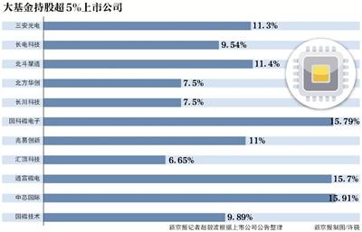 据通富微电今年2月底公告披露,大基金当前持有三安光电11.3%的股份、长电科技9.54%的股份、北斗星通11.4%的股份、北方华创7.5%股份、长川科技7.5%股份、国科微电子15.79%股份、兆易创新11%的股份、汇顶科技6.65%股份、通富微电15.7%股份。