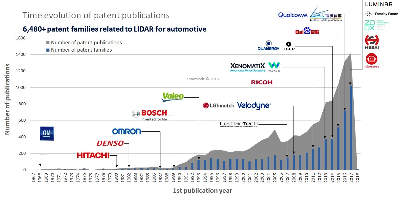 Knowmade技术与专利分析师Paul Leclaire将上述那些厂商形容为“历史性IP厂商”;根据他的观察,他们的专利大多数是“与先进驾驶辅助系统(ADAS)应用相关,根据渐进发展技术以及利用有限的空白(white spaces)区域;”所谓的“空白区域有限”,意味着很难在已经有其他专利、不重叠的情况下申请新专利,在这种情况下专利申请获得批准的机会较低。