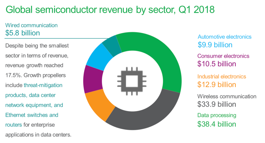 2018年Q1电子产品用半导体营收达1114亿美元,同比增长17%