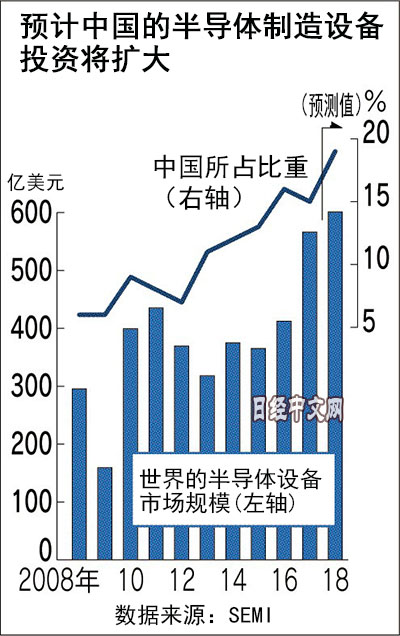 国际半导体设备与材料协会(SEMI)预测,2018年中国的半导体制造设备市场规模将同比增长4成,增至113亿美元。从包含外资厂商的中国工厂的这一数据来看,中国的市场规模将跃升至全球第2,仅次于韩国,占据整体市场的2成。