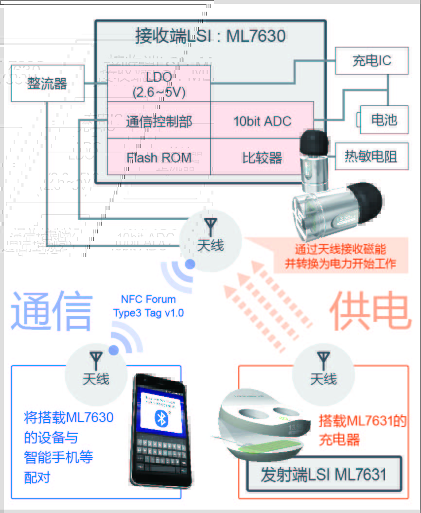 接收端的“ML7630”可利用供电时产生天线磁场来供电,因此即使电池电量耗尽也可开始工作。