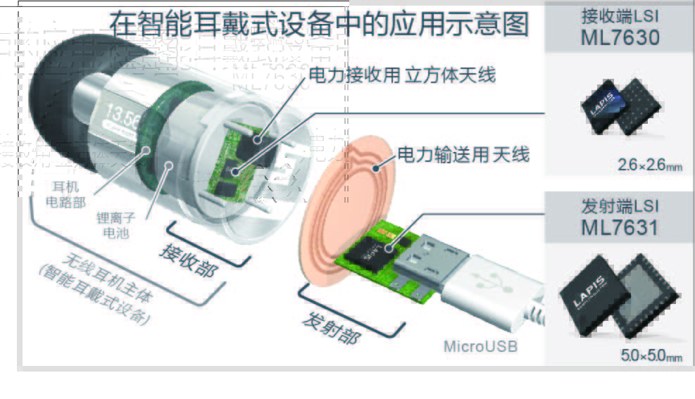 本芯片组是一款无线供电控制LSI,适用于可穿戴式设备中特别是有安装空间限制的Bluetooth®耳机等智能耳戴式设备※1的无线供电。为了能够支持在智能耳戴式设备中的应用,蓝碧石半导体通过在13.56MHz的高频段进行电力传输,将天线(线圈)小型化,同时将充电所需的功能集成于1枚芯片,使之作为SoC※2(片上系统)使用,从而大大削减了安装空间(与MicroUSB连接器的面积相比减少50%)。实现了以往很难实现的智能耳戴式设备的无线供电,不仅有助于设备的小型化,还有助于提高充电的便利性、防水性和防尘性。