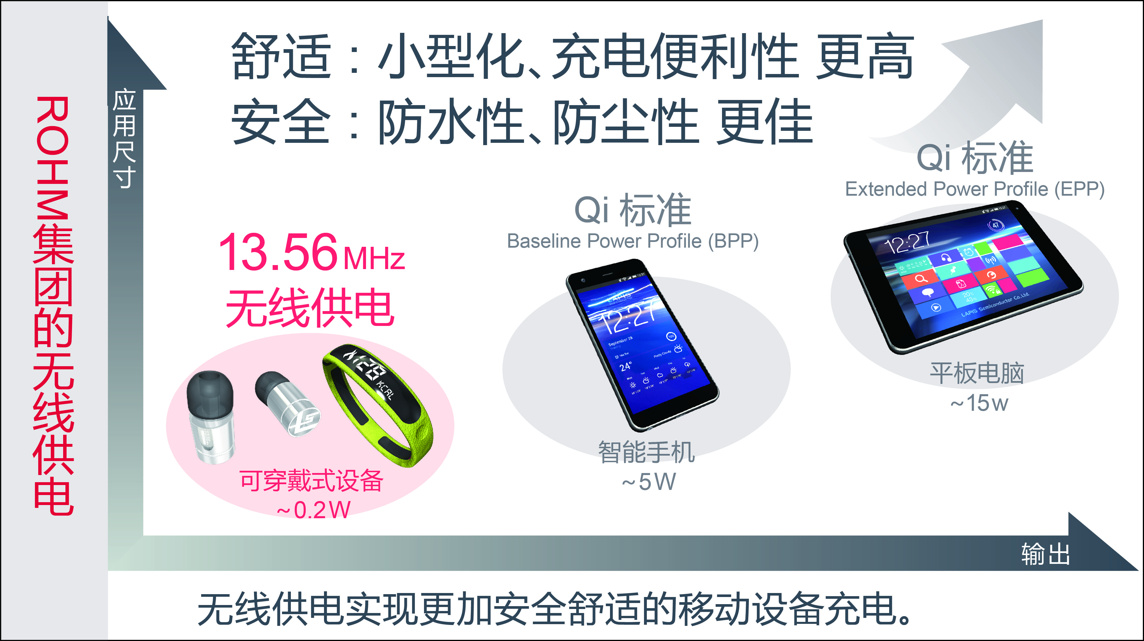一直以来,ROHM集团面向智能手机和平板电脑等终端,不断地开发并供应满足无线供电标准(WPC Qi等)的产品。蓝碧石半导体作为NFC Forum的主要成员--ROHM集团的旗下公司,一直与ROHM一同积极参与适用于需要超小型无线供电系统的可穿戴式设备的13.56MHz无线供电标准的制定。
