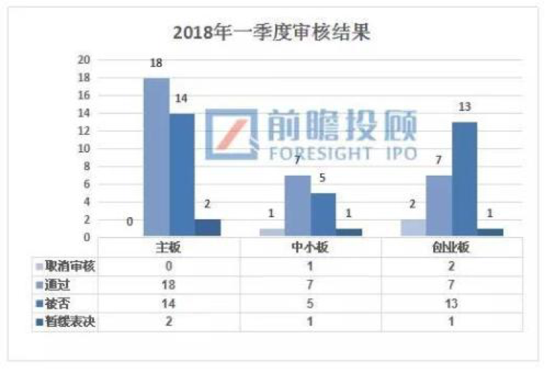 据前瞻投顾最新统计,2018年一季度剔除二次上会企业,共71家IPO企业首发上会,其中,32家顺利过会,32家被否,3家取消审核(剔除2家二次上会),4家暂缓表决(剔除1家已二次上会),过会率仅有45.07%。
