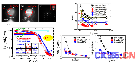 由于在该方法中,纳米线沟道由单晶硅衬底制作形成,导电沟道中材料晶格缺陷更少、界面质量更高。两种高k金属环栅纳米线晶体管都表现出很好的器件特性,其中通过氧化制备的“倒水滴形”环栅纳米线晶体管在16nm物理栅长(对应5nm及以下技术代)下,获得器件亚阈值特性SS = 61.86 mV/dec 和DIBL = 6.5 mV/V,电流开关比大于1E8。SS和DIBL十分接近MOSFET的理论极限数值(60mV/dec和0 mV/V),远超以往同类工艺制造的FinFET性能参数,也达到目前同类器件所报道的最高水平。