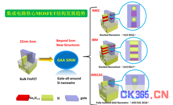 近日,中国科学院微电子研究所集成电路先导工艺研发中心在面向5纳米以下技术代的新型硅基环栅纳米线(Gate-all-around silicon nanowire,GAA SiNW)MOS器件的结构和制造方法研究中取得新进展。