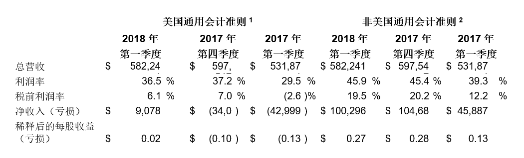 1. 2018年第一季度的部分费用已被重新归类为收入成本。历史结果符合2018年第一季度展示材料