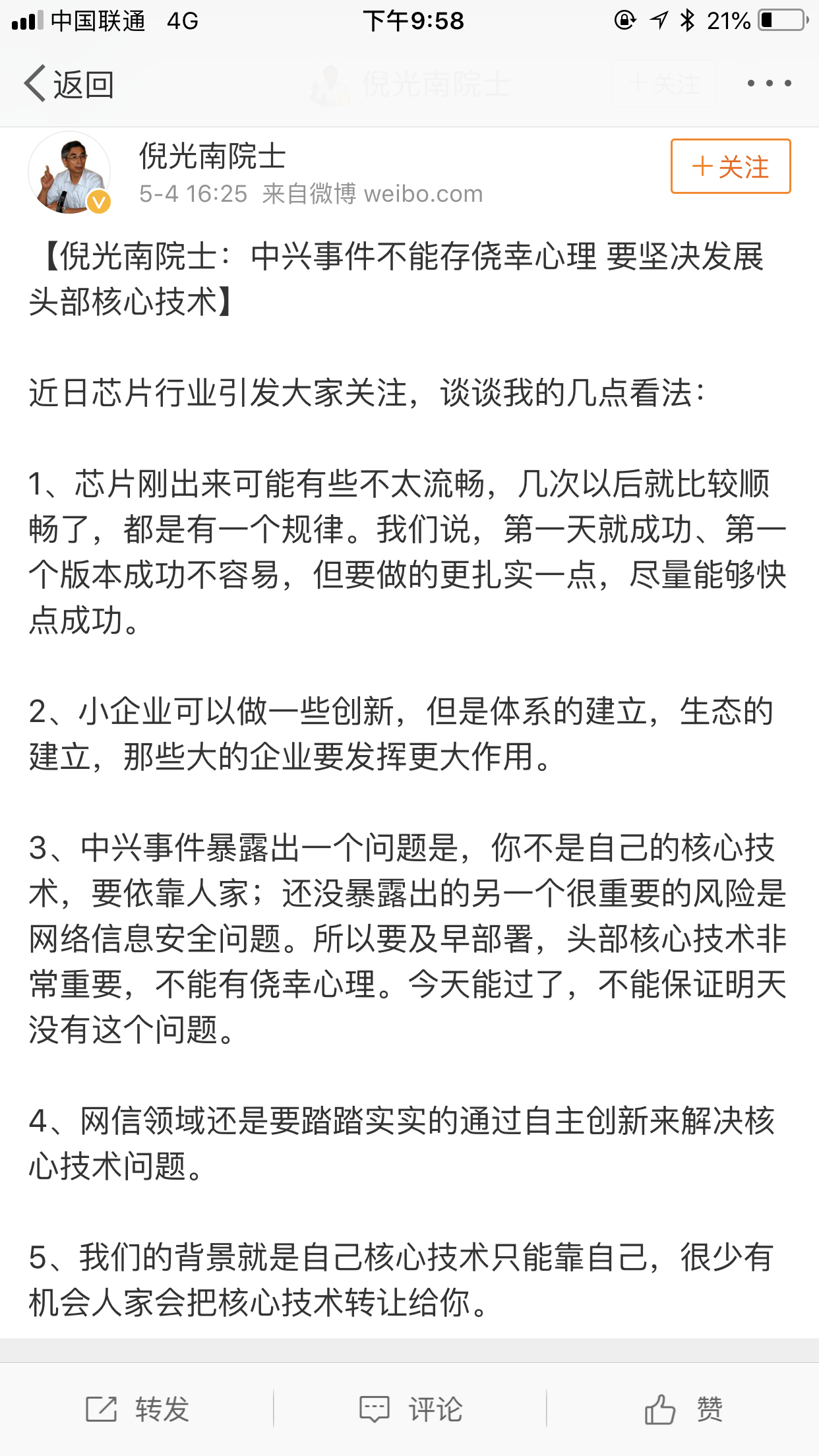 5月4日消息,倪光南院士今日公开发文谈中兴事件: