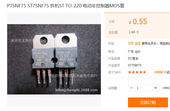 仿品和拆机件由于多来自于深圳,价格是其能够畅销的绝对优势。以1688网MOS贸易商给记者发来的价格为例,ST75N75拆机件5毛钱,国产仿品质量最高的单价1.42元,品质一般的只要9毛钱,较正规国产品牌价格更低。
