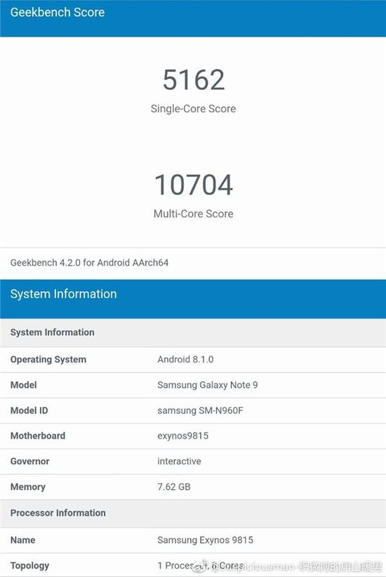 近日一款型号为SM-N960F的三星手机现身Geekbench4跑分网站,在内置8GB内存的情况下,单核5162的跑分,多核10704的成绩远远的把苹果的A11甩在了身后(A11单核跑分4061分,多核跑分9959分),三星还真是安卓之光。