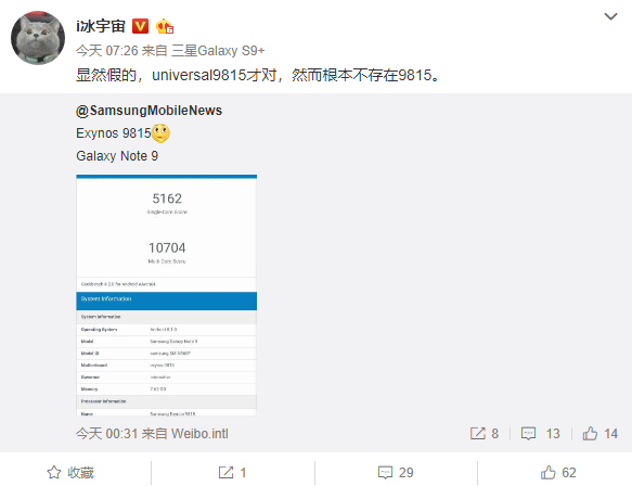 不少人看到这里,可能会为三星而欢呼雀跃,安卓的移动处理器终于在性能方面超越了苹果的A系列最新处理器,不过事情发生了反转。有数码发烧友毫不犹豫地指出那张exynos 9815的跑分图是假的,理由如下:Model那项是代号,samsung SM-N960F,至少早期是这样的。没有Model id这项。Motherboard是universalxxxx。Governor怎么会从scheutil换回interactive?Memory的单位是MB。Name是ARMv8。