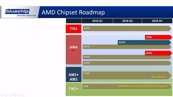 目前国外电商BlueChip在网上曝光了一份AMD以及Intel的全新的芯片组的计划表,当然这些芯片组的计划是包含在自家制作的新PPT上面。根据BlueChip提供的PPT,AMD的Z490芯片组将会在6月正式公布,而B450芯片组的发售时间为7月底,和X370芯片组不同的是,Z490芯片组主要改进在于多了几条PCI-E通道。