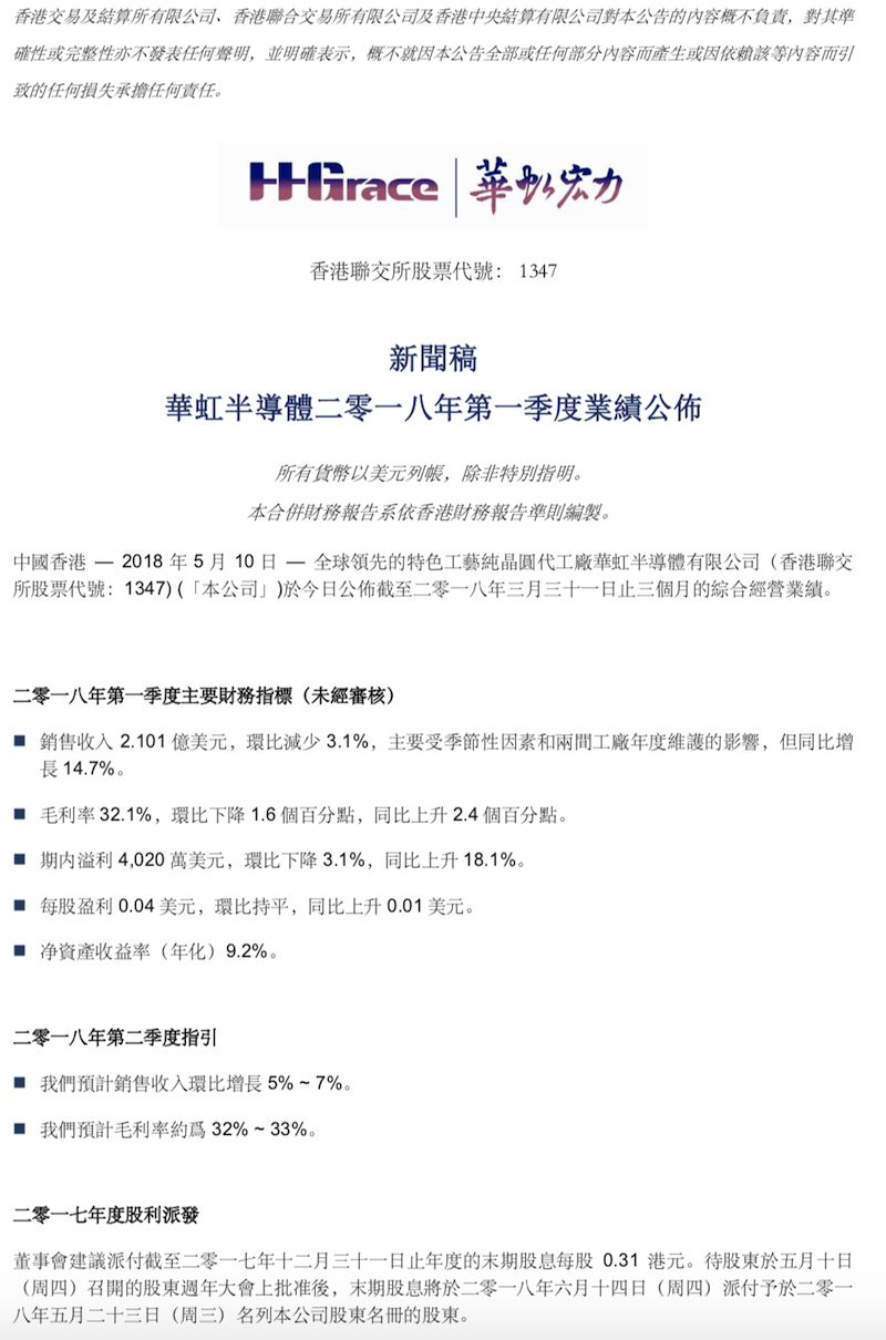 2018年5月10日,华虹半导体公布了截至2018年3月31日的第一季度综合经营业绩。