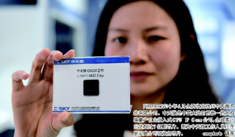 阿里巴巴在今年4月全资收购杭州中天微系统有限公司。中天微是中国大陆目前惟一的大规模量产自主嵌入式CPUIPCore公司,全球累计出货超过7亿颗芯片。图为中天微工作人员正在展示其公司研发的芯片。cnsphoto 供图