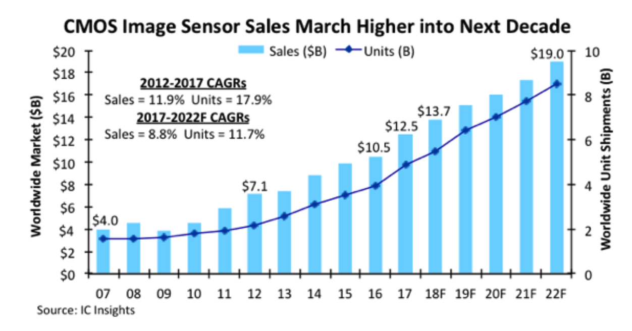 虽然,2016年智能手机市场的成熟,使得CMOS图像传感器的销售额增长速度放缓到了6%,但是其他应用的需求强劲。因此,在过去的2017年,图像传感器的收入增长了19%,达到了125亿美元。