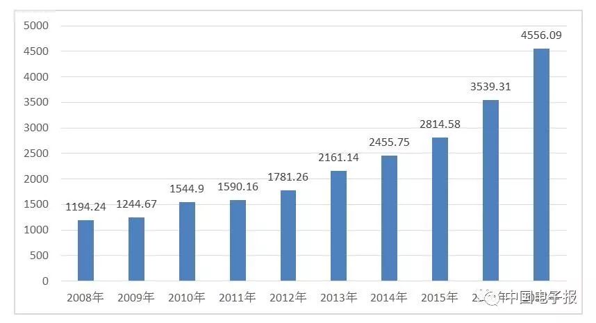 近10年电子元件百强企业主营业务收入增长图(单位:亿元人民币)
