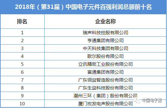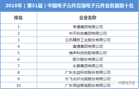 2018中国电子元件百强发布,亨通、瑞声科技、中天科技居前三