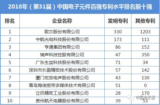 按照发明专利与其他专利2.5∶1的权重衡量本届电子元件百强的专利水平,歌尔股份、中航光电和亨通集团三家公司跟前两届一样,包揽了前三名。歌尔股份有限公司2017年获得了330项发明专利和1203项其他专利,依然远超诸强,连续三年授权专利数超千项,歌尔股份创造了电子元件百强的新纪录。