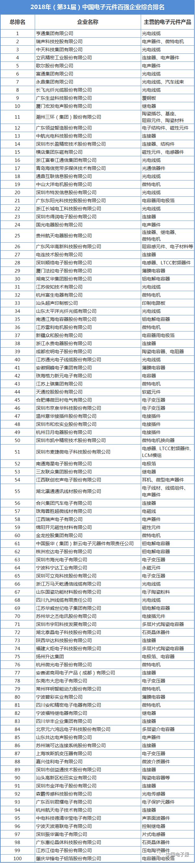 在中国电子元件重点骨干企业的支持与协助下,中国电子元件行业协会信息中心经过历时4个月努力,2018年(第31届)中国电子元件百强企业排序工作圆满完成,100家在规模实力、财务状况、研发能力等方面表现优异的中国电子元件骨干企业入选新一届中国电子元件百强。