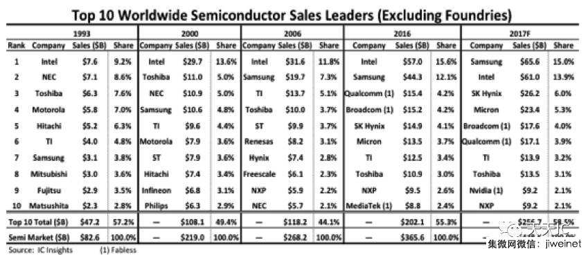 2001 年时,全球前 20 大半导体企业中尚无一家 IC 设计企业入围,而到 2014 年,IC 设计企业已经占据全球 TOP20 半导体企业中的 6 席。而到2017年,据 IC Insights 报告显示,2017 年,无晶圆 IC 厂商(IC设计公司)占全球IC销售额的 27%,比 2007 年的 18% 增长了9个百分点。高通、博通和英伟达均进入前十的行列。