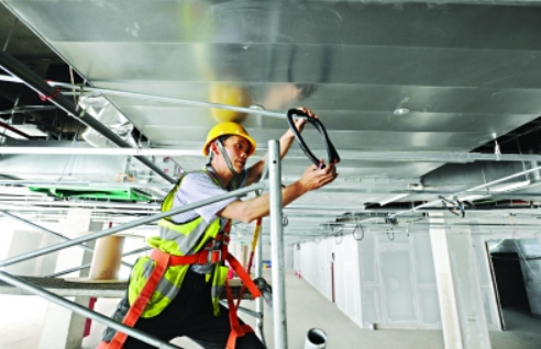 5月14日,国家存储器基地项目(一期)一号芯片生产厂房内,工人正在安装线缆 记者高勇 摄