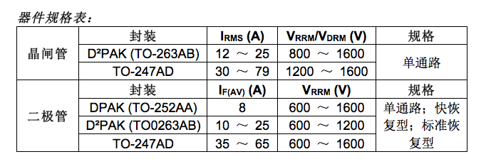 今天发布的这些器件采用表面贴装的DPAK(TO-252AA)和D2PAK(TO-263AB)封装,还有通孔TO-247AD封装。9个新晶闸管在导通状态下的连续有效电流范围从12A到79A,28个标准和快恢复二极管的正向电流范围从8A到65A。这些器件能承受1000V/μs的抗扰能力。