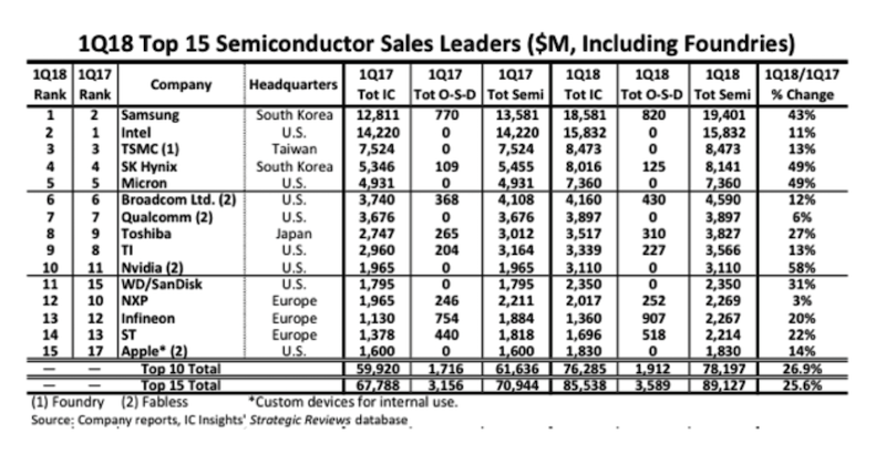 总的来说,2018年第一季度,前十五大半导体公司的销售额同比增长26%,而同期全球半导体产业的增长率仅为6%。前十五大半导体公司比全球增长率高出了二十个百分点。