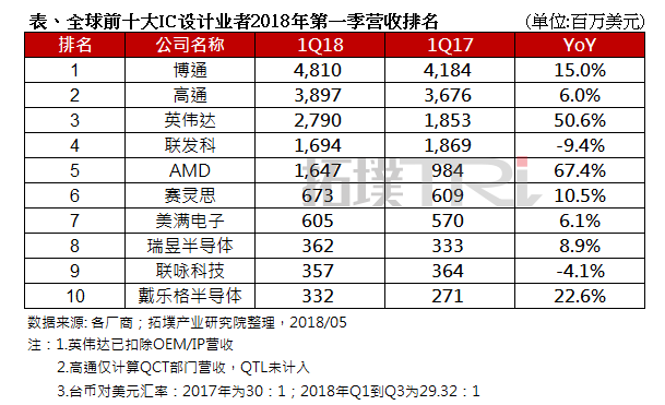 几家欢喜几家愁?全球前十大IC设计公司2018年Q1营收排名出炉