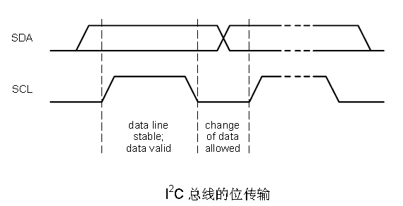 在I2C总线上传送的每一位数据都有一个时钟脉冲相对应(或同步控制),即在SCL串行时钟的配合下,在SDA上逐位地串行传送每一位数据。进行数据传送时,在SCL呈现高电平期间,SDA上的电平必须保持稳定,低电平为数据0,高电平为数据1。只有在SCL为低电平期间,才允许SDA上的电平改变状态。逻辑0的电平为低电压,而逻辑1的电平取决于器件本身的正电源电压VDD(当使用独立电源时)。数据位的传输是边沿触发。