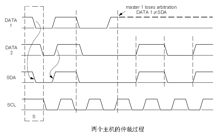 I2C 总线的地址和数据信息由赢得仲裁的主机决定,在仲裁过程中不会丢失信息。丢失仲裁的主机可以产生时钟脉冲直到丢失仲裁的该字节末尾。