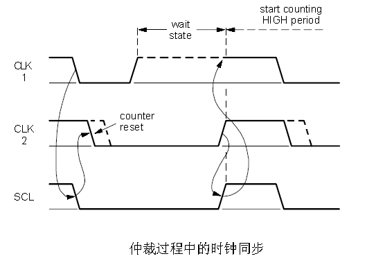 在I2C总线上传送信息时的时钟同步信号是由挂接在SCL线上的所有器件的逻辑“与”完成的。SCL线上由高电平到低电平的跳变将影响到这些器件,一旦某个器件的时钟信号下跳为低电平,将使SCL线一直保持低电平,使SCL线上的所有器件开始低电平期。此时,低电平周期短的器件的时钟由低至高的跳变并不能影响SCL线的状态,于是这些器件将进入高电平等待的状态。当所有器件的时钟信号都上跳为高电平时,低电平期结束,SCL线被释放返回高电平,即所有的器件都同时开始它们的高电平期。其后,第一个结束高电平期的器件又将SCL线拉成低电平。这样就在SCL线上产生一个同步时钟。可见,时钟低电平时间由时钟低电平期最长的器件确定,而时钟高电平时间由时钟高电平期最短的器件确定。