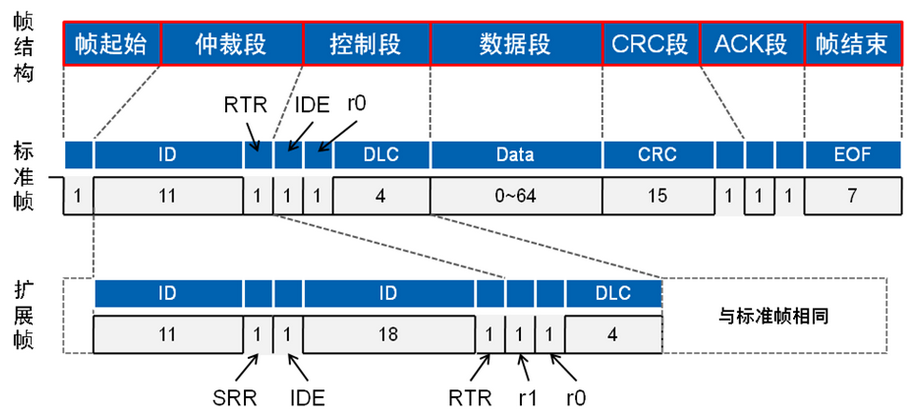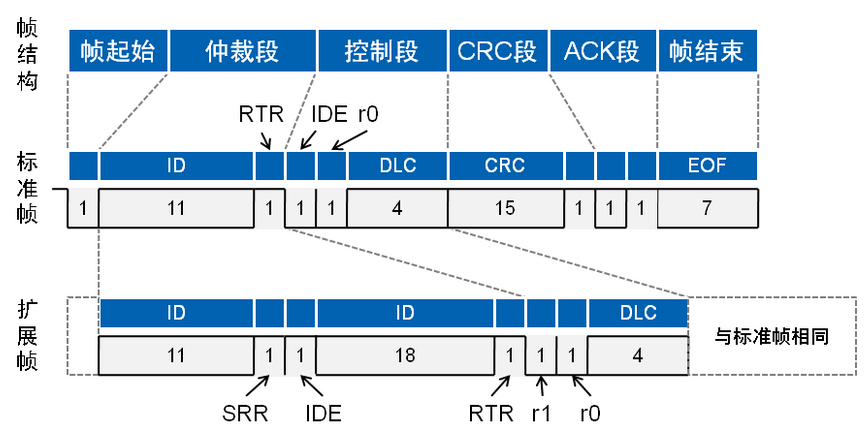 扩展帧仲裁段:扩展帧的仲裁段由29位ID码、一位显性的SRR码、一位隐性的IDE码和一位显性的RTR码组成;