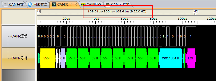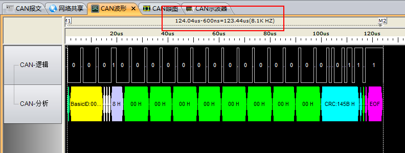 由于位填充规则的存在,所以就存在即使两个帧都是标准数据帧,但发送不同ID或者数据段的时候报文时间会不同,图5为1M波特率下ID跟数据都为0x00的标准数据帧报文。原本108个位的标准数据帧的真实的报文时间为123us。
