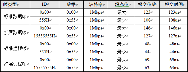 下表给出了标准数据帧、扩展数据帧、标准远程帧、扩展远程帧四种帧类型在发送不同ID和数据时位时间的差别。