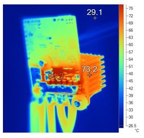 CSD885x电源模块采用DualCool™封装,可在封装顶部实现散热,从而将热量从电路板上散开,提供出色的散热性能,并提高在5mm×6mm封装中的功率。根据数据手册规范,功率块具有1.1°C/W的结到底壳体热阻,和2.1°C/W的结到顶壳体的热阻。您可优化功率块底壳的PCB或功率块的顶盖的散热片的冷却功能。图6所示为在1kW,36V三相逆变器PCB(36mm×50mm)内使用三个CSD88599Q5DC双冷60V电源模块测试的顶侧公共散热器(27mm×27mm×23mm)的结果,不带任何气流。在测试期间,散热器和功率块顶壳之间使用具有低热阻抗(Rθ<0.5°C / W)的电绝缘热接口。