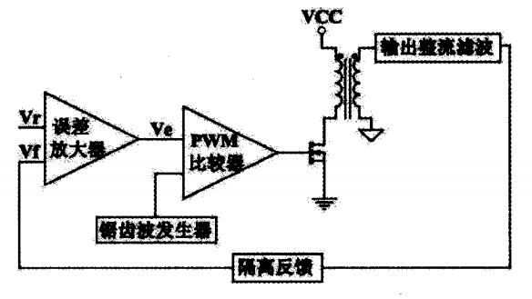 目前应用广泛的PWM控制器都是采用电压模式控制的,它只对输出电压进行采样,采样信号Vf作为反馈信号与基准电压vr在误差放大器中进行比较放大,得到误差信号Ve,ve和锯齿波信号比较后通过PWM比较器输出一系列高频脉冲来控制开关管的导通和截止,它的主要缺点是:响应速度慢,稳定性差,甚至在大信号变化时会产生振荡,造成功率管损坏等故障。