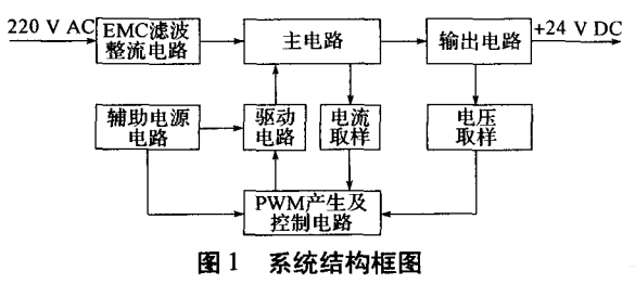 一个完整的、独立工作的AC/DC开关电源通常包括EMC(electromagneTIccompaTIbility)滤波整流电路、主电路(含功率变换器、隔离变压器)、PWM(pulsewidthmodulaTIon)产生及控制电路、驱动电路、输出电路、辅助电源电路、取样电路。本文设计的系统结构框图如图1所示。其工作原理是:输入交流市电220V,经过EMC滤波整流电路、主电路、输出电路后,得到24V直流电压;同时,采用电流取样和电压取样构成双闭环控制机制,经PWM控制芯片调节PWM波形,再通过驱动电路控制功率开关管的导通和关断,从而实现24V直流电压的稳定输出。