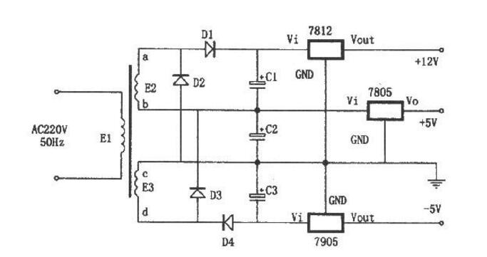 如图所示为一种特殊的电源电路。该电路虽然简单,但可以从两个相同的次级绕组中产生 出三组直流电压:+5V、-5V和+12V。其特点是:D2、D3跨接在E2、E3这两组交流电源之间,起着全波整流的作用。