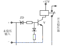 当未稳压输入的电压值正常时,稳压管ZD击穿,晶体管V导通,继电器动作,触点吸合,开关稳压器加电。当输入低于所允许的最低电压值时,稳压管ZD不通,V截止,触点跳开,开关稳压器不能工作。