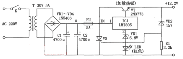 稳压电源正常输出电压为12.2V,当稳压电路异常使输出电压升高至超过15V时,稳压二极管VD2反向击穿导通,单向可控硅VS控制极得到触发电流而导通,迫使5A熔断器FU迅速熔断而保护后级电路。