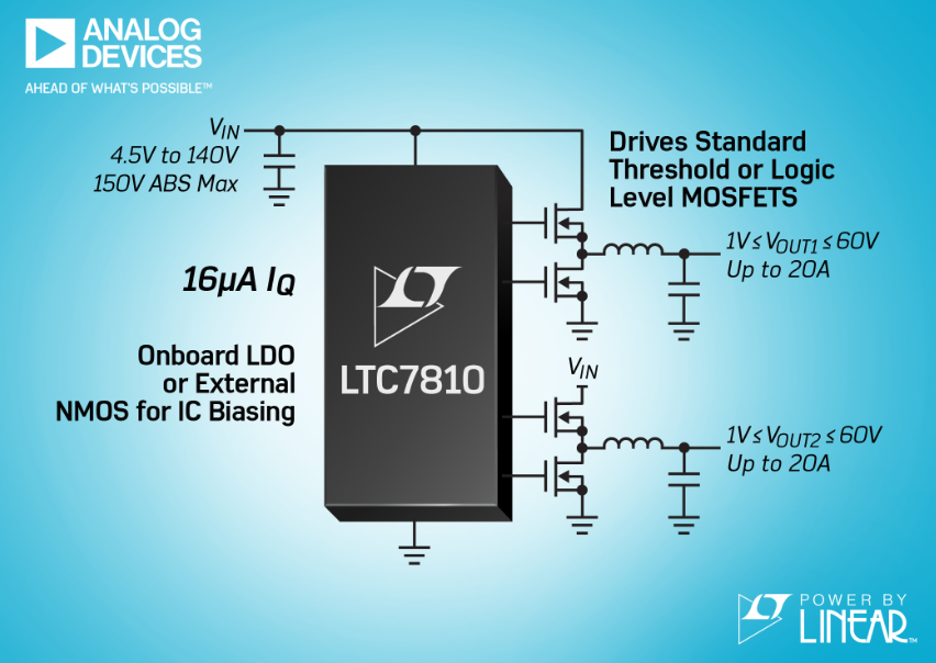 中国,北京 – 2018 年 3 月 6 日 - Analog Devices, Inc. (ADI) 宣布推出 Power by Linear™ 的 LTC7810,该器件是一款高电压非隔离式双输出同步降压型 DC/DC 控制器,其用于驱动全 N 沟道 MOSFET 功率级。其 4.5V 至 140V (150V 绝对最大值) 输入电压范围专为采用一个高输入电压或一个具有高电压浪涌的输入工作而设计,从而免除了增设外部浪涌抑制器件的需要。LTC7810 在输入电压降到低至 4.1V 时可以高达 100% 的占空比操作,因而非常适合交通运输、工业、机器人和数据通信应用。