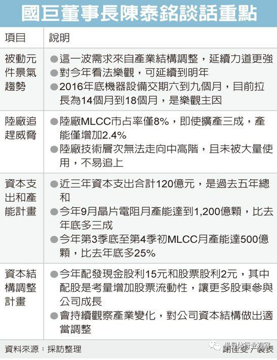 被动元件龙头国巨董事长陈泰铭昨(8)日表示,这波被动元件需求不是来自单一杀手级产品,而是整体产业结构改变,加上供应商节制扩产,预估景气强度将延续较久, 2018年至2019年都审慎乐观。