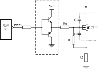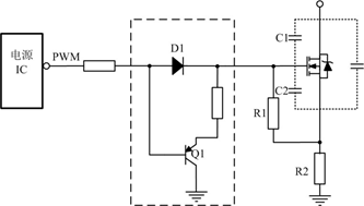 如果选择MOS管寄生电容比较大,电源IC内部的驱动能力又不足时,需要在驱动电路上增强驱动能力,常使用图腾柱电路增加电源IC驱动能力,其电路如图 2虚线框所示。