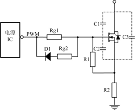 关断瞬间驱动电路能提供一个尽可能低阻抗的通路供MOSFET栅源极间电容电压快速泄放,保证开关管能快速关断。为使栅源极间电容电压的快速泄放,常在驱动电阻上并联一个电阻和一个二极管,如图3所示,其中D1常用的是快恢复二极管。这使关断时间减小,同时减小关断时的损耗。Rg2是防止关断的时电流过大,把电源IC给烧掉。