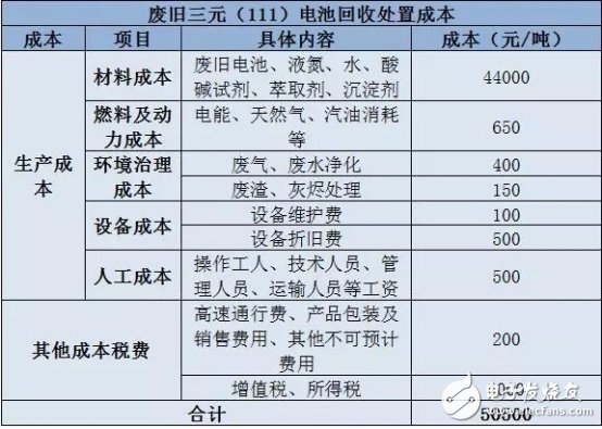 除了产业趋势判定外,中国电池联盟根据现有回收的技术和市场情况,对动力电池回收处置收益率进行了测算。从表格中可以看出,在成本构成方面,材料成本占主导地位,约占总成本的87%,其中材料成本以回收废旧动力电池的成本最高。现阶段,废旧的三元电池(111型)回收价格约为4万元/吨,磷酸铁锂电池的回收价格约为1.4万元/吨。
