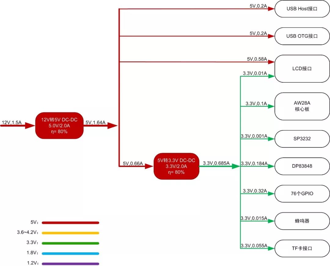 电源IC块中:第一行,电源芯片型号;第二行,输出电压,电流值;第三行,转换效率η;
