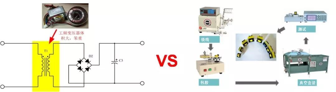 比如设计开发一个市电交流输入转直流输出的,很多人的第一时间就想到采用工频变换电路方案,因为此方案比较简单,一个工频变压器,再加上个整流滤波就可以搞定,如下图6所示。使用此方案的产品的效率非常低,并且产品的体积会非常之大,在应用中还伴随着让人非常闹心的工频涡流声。而模块方案选用合适的变压器,并且多重工序层层保证变压器的产品一致性,保证产品最终性能。