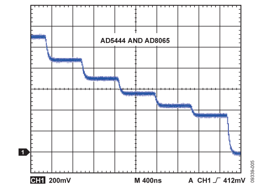图3 所示为使用 12 位 AD5444 产生的更新速率为 1 MHz 的 20 kHz 正弦波,每个周期有 50 个采样点。AD5444 的最大更新速率为 2.7 MSPS。若要产生采样点更多的波形,必须使用更快的更新速率。并行接口的 AD5445 提供 20 MSPS 的最大更新速率。